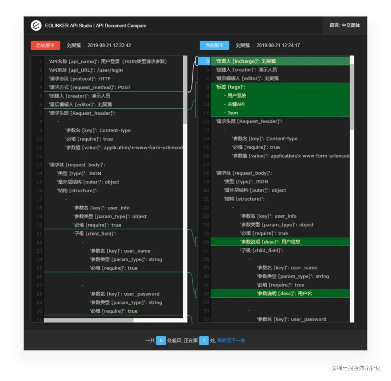同时,有时候需要对比不同版本的接口信息,我通常用的是Eolinker上的版本管理功能,可以清楚记录并让我看到各个版本的接口信息对比,直接注册就可以在网页上用,贴在下面