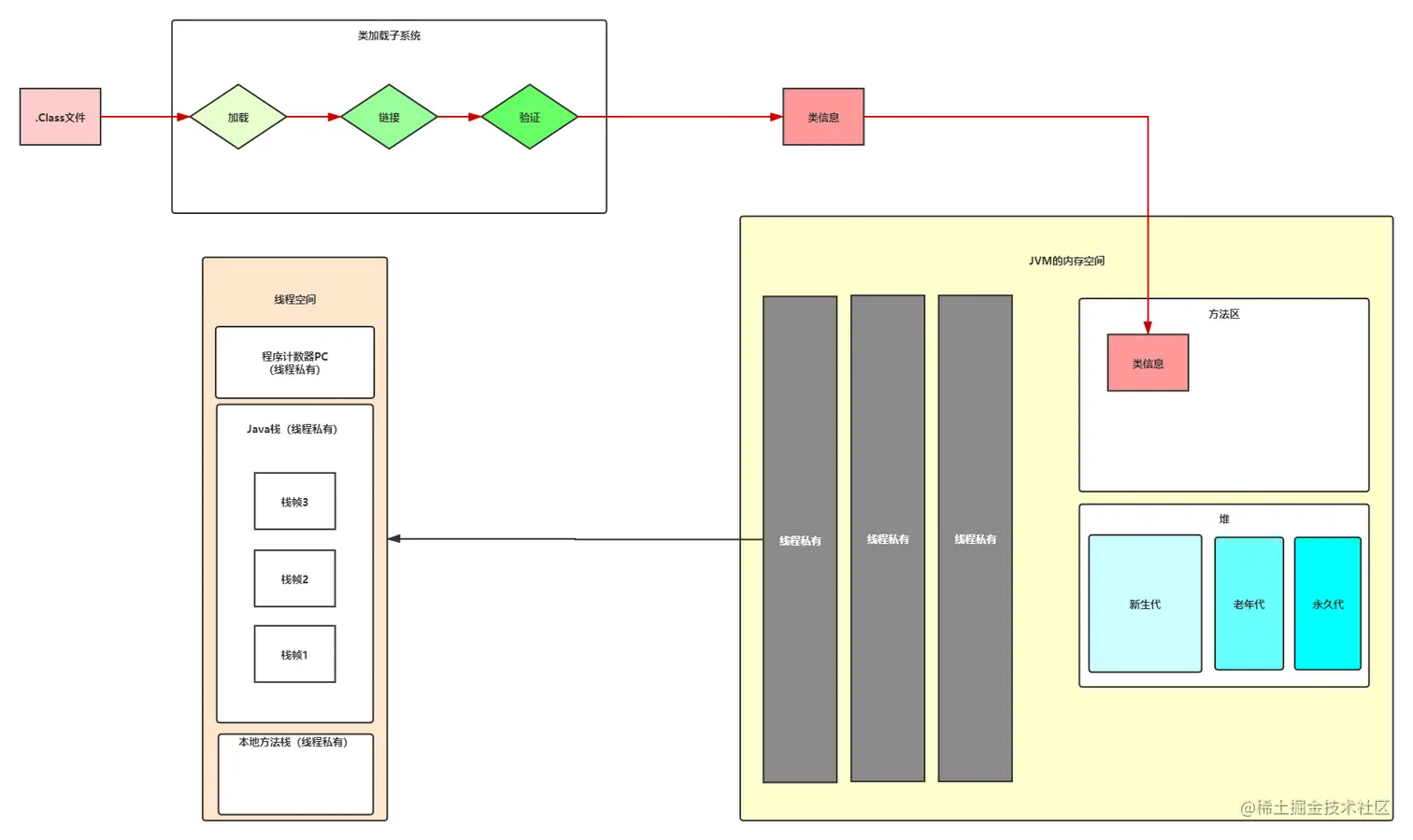 .Class文件会被类加载子系统读入JVM中的方法区当中,在方法区中,存放了最基本的类信息,而类加载子系统运行的各个阶段会为我们类赋值、调用静态方法等等。如图中的红线,就是类加载的主要过程。