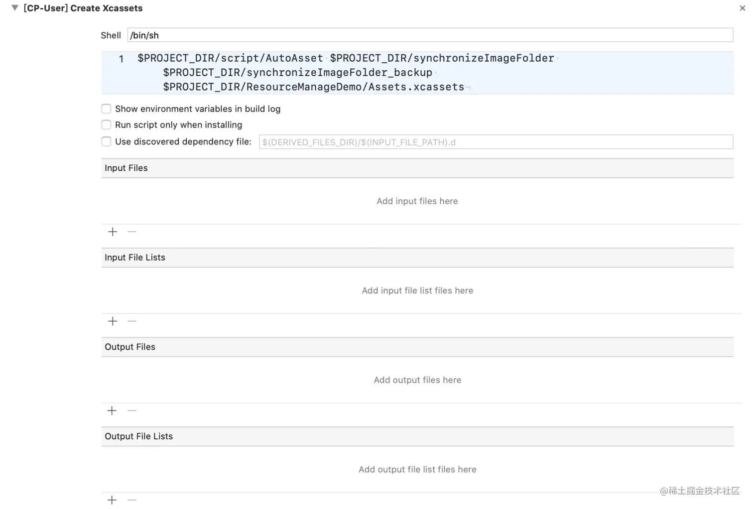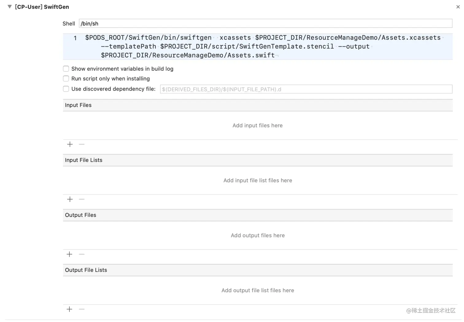 $PODS_ROOT/SwiftGen/bin/swiftgen xcassets $PROJECT_DIR/ResourceManageDemo/Assets.xcassets --templatePath $PROJECT_DIR/script/SwiftGenTemplate.stencil --output $PROJECT_DIR/ResourceManageDemo/Assets.swift