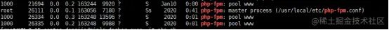 Docker搭建php环境,php-fpm主进程是root用户,php脚本的执行是子进程执行的,而子进程是www-data用户(docker要求子进程用户要低于root用户),映射到了宿主机用户为1000。如下图: