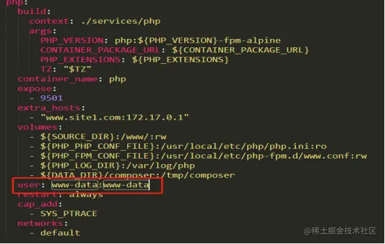 - 宿主机创建一个www-data用户组和www-data用户,将此用户映射到docker 容器里面。docker run -u www-data:www-data 或者Docker-compose.yaml的配置如下