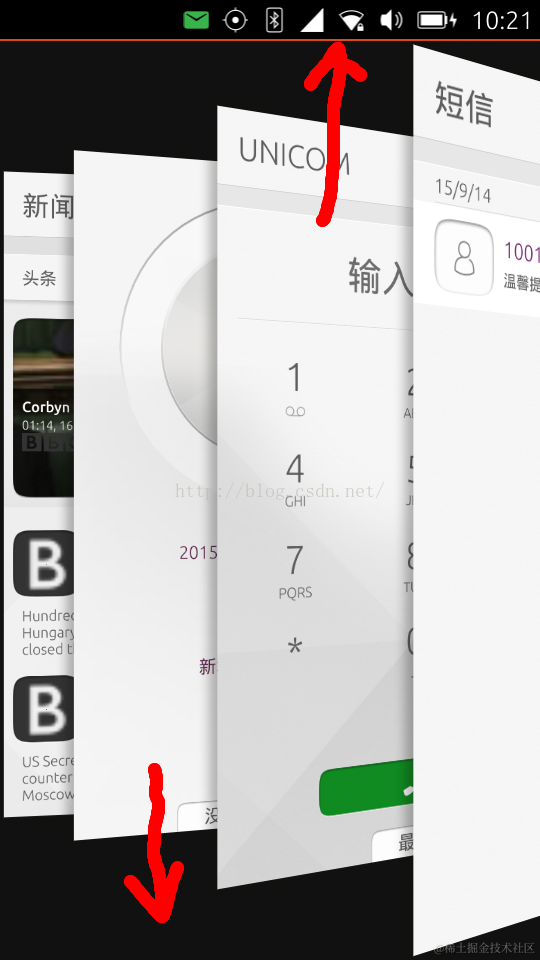 在Ubuntu平台上,我们一般不需要退出自己的应用.我们一般交给操作系统来帮我们关掉自己的应用(在资源紧张时,有系统的调度器去管理).当然,我们也可以在手机中,从最右边向左滑动,出现如下的应用管理器: