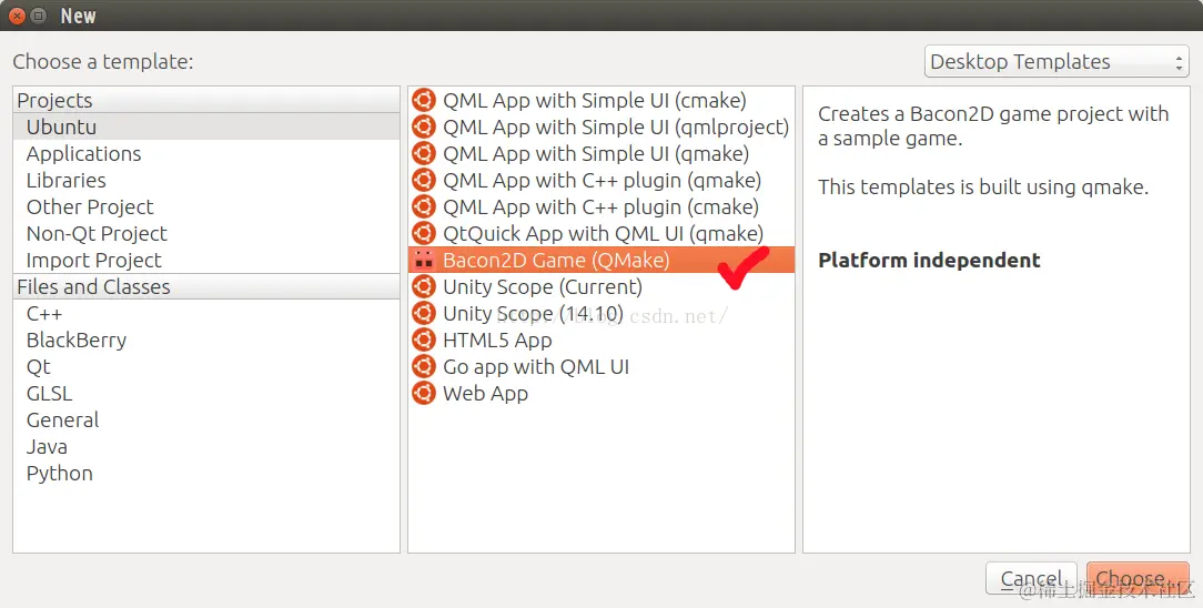 我们选择"Bacon2D Game (QMake)"模版,创建一个叫做"bacon2dtest"的应用: