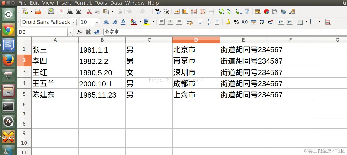 首先,在Ubuntu桌面上,我们可以使用我们的LibreOffice来创建一个我们的数据表:
