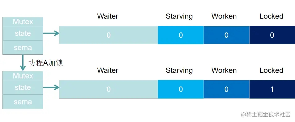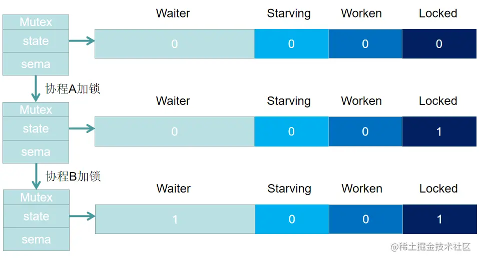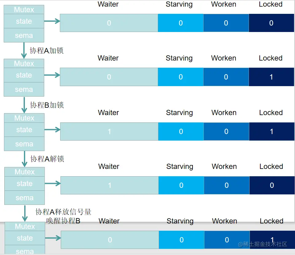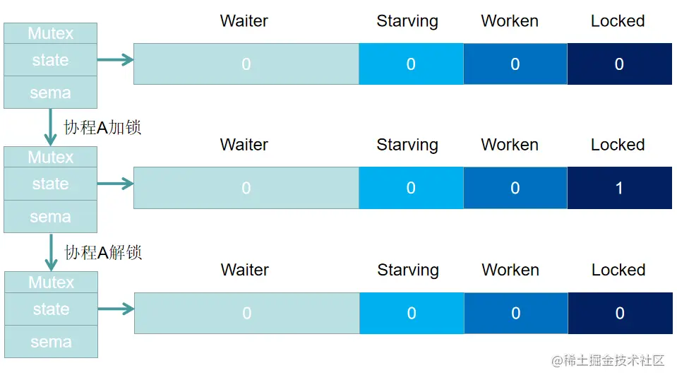 协程A加锁之后,Locked 置1,此时协程B准备加锁,发现Locked 为 1(Mutex已经被抢占),此时协程B进入阻塞状态,且Waiter 计数 +1,此时协程A解锁时,一共有两步:1. 将Locked 置 0,2. 查看 Waiter >0,释放一个信号量,唤醒一个阻塞的协程,被唤醒的 协程B将 Locked位置1,于是,协程B获得锁。