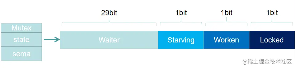 state 是 32 位的整型变量,内部实现时把该变量分成四份,用于记录Mutex的四种状态。