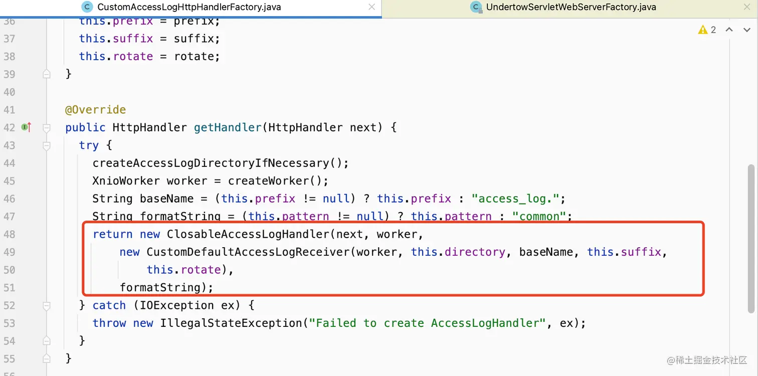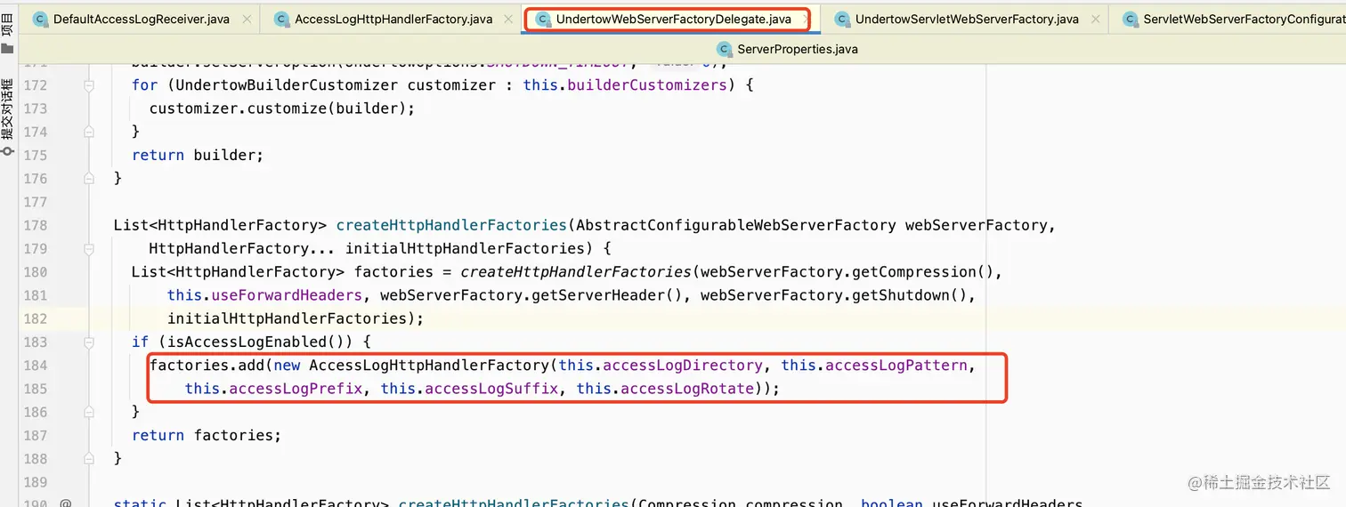 通过启动springboot,每个地方打个断点来看是否走到了这些地方来找到调用的流程(没错就是这么low),可以找到AccessLogHttpHandlerFactory这个类的getHandler方法生成了DefaultAccessLogReceiver对象