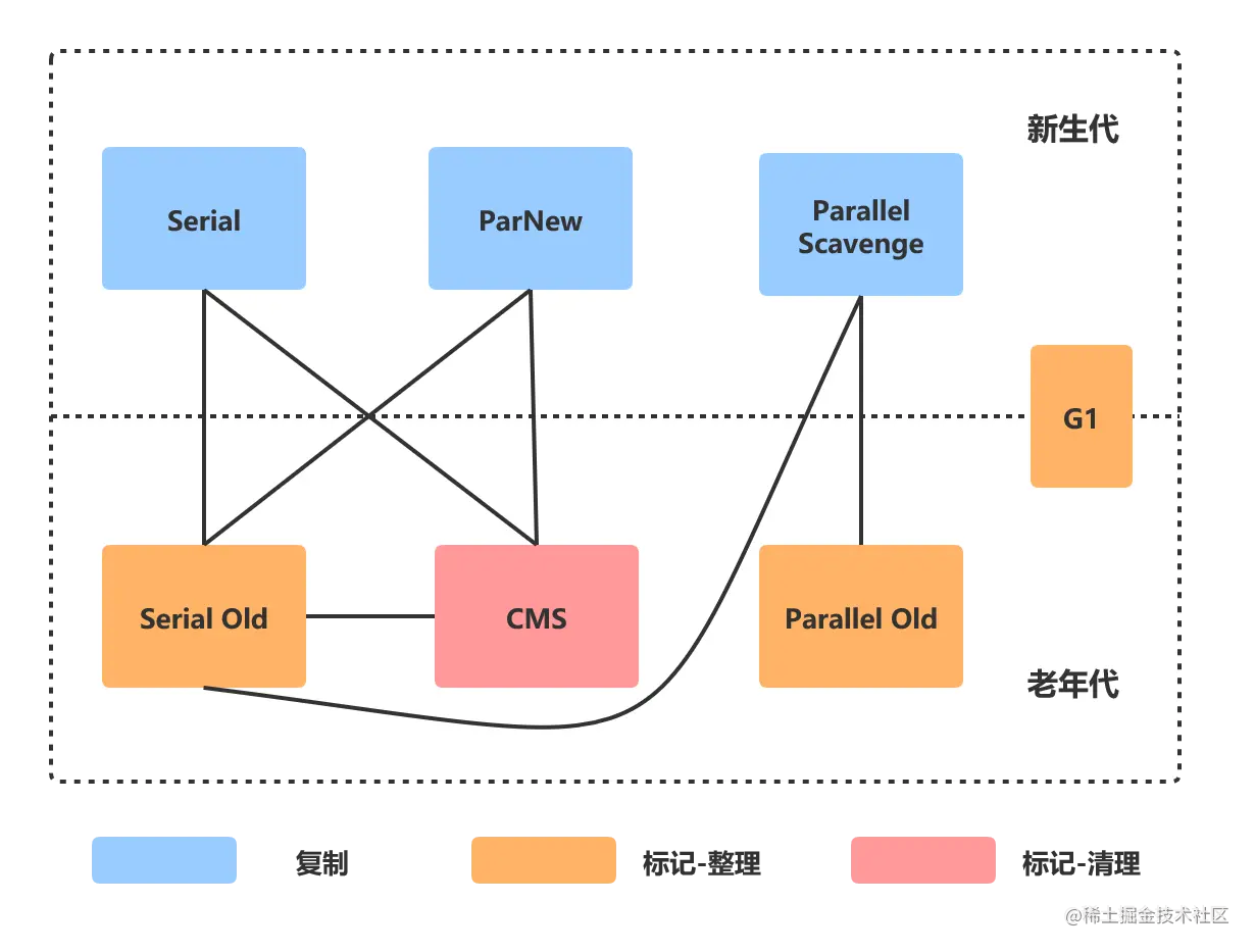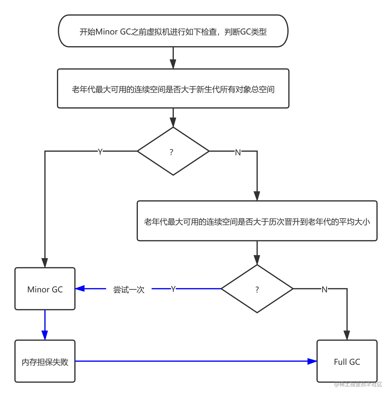 在发生Minor GC之前,虚拟机会先检查老年代最大可用的连续空间是否大于新生代所有对象总空间,如果条件成立那么Minor GC是安全的。如果不成立,会继续检查老年代最大可用的连续空间是否大于历次晋升到老年代的平均大小,如果条件满足,则尝试进行一次Minor GC,这次Minior GC需要空间内存担保并且担保失败了,则会发起一次Full GC。
