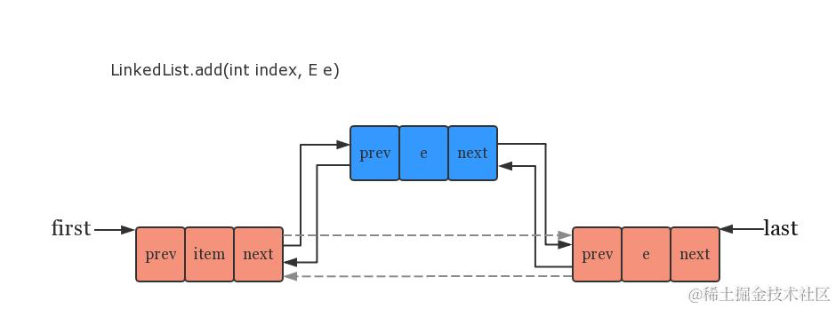 - 图中所展示的是一个双向链表,即每个结点除了包含实际的数据外,还存在两个引用分别指向上一个结点(prev)和下一个结点(next),各个结点通过这种双向链接从而串联在一起。此外还存在两个引用分别指向头结点(first)和尾结点(last),方便进行正向遍历和反向遍历