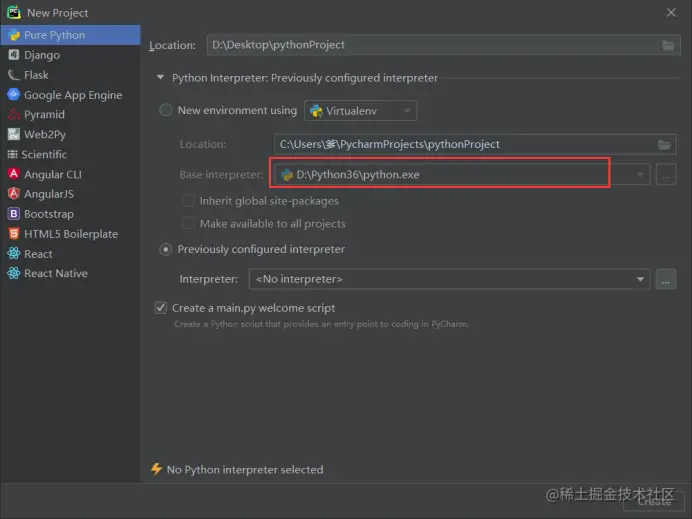 最后我们将Tensorflow环境嵌入到编辑器中,这里就用pycharm了,新建一个工程,接口记得选用Anaconda目录下的python3.6