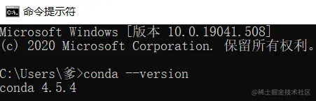 然后进行环境变量的测试,先打开cmd,检测anaconda环境是否安装成功:conda --version