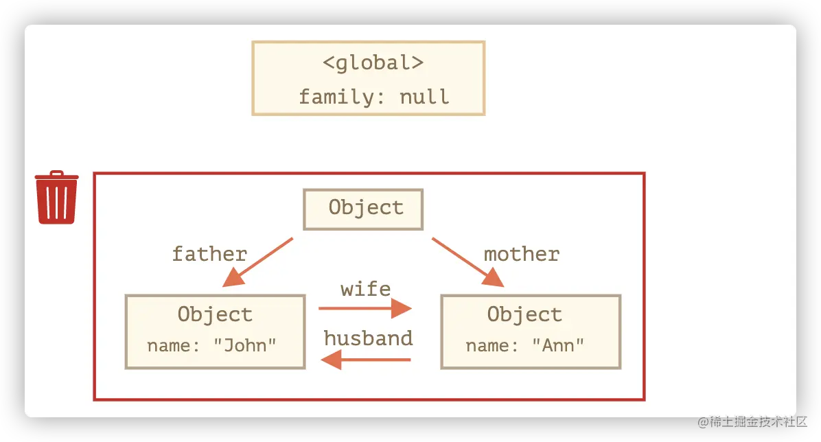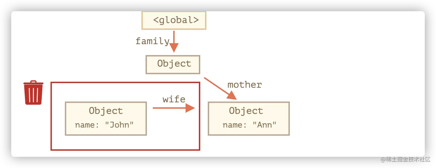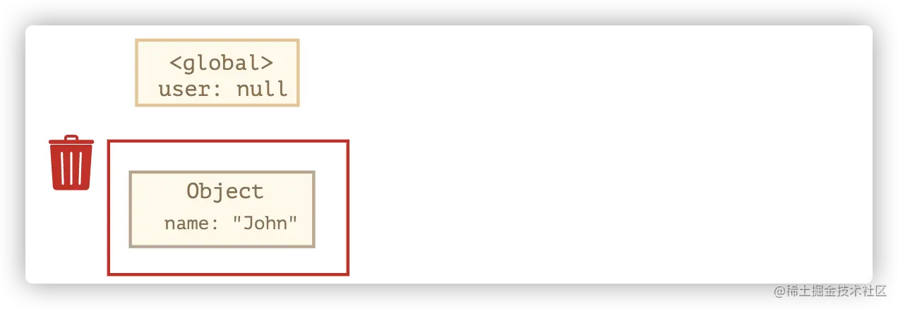 {name:John}不再可达,那么它就会被回收。