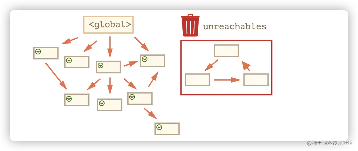 - 被引用与可访问(从一个根)不同:一组相互连接的对象可能整体都不可达。
