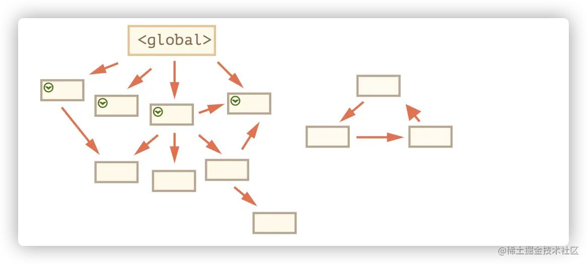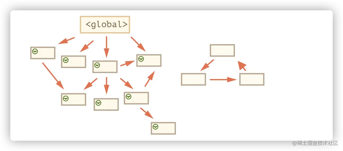 3.此时发现有一个数据,从来没有被根(全局变量能访问到的)引用到,就把它回收掉。