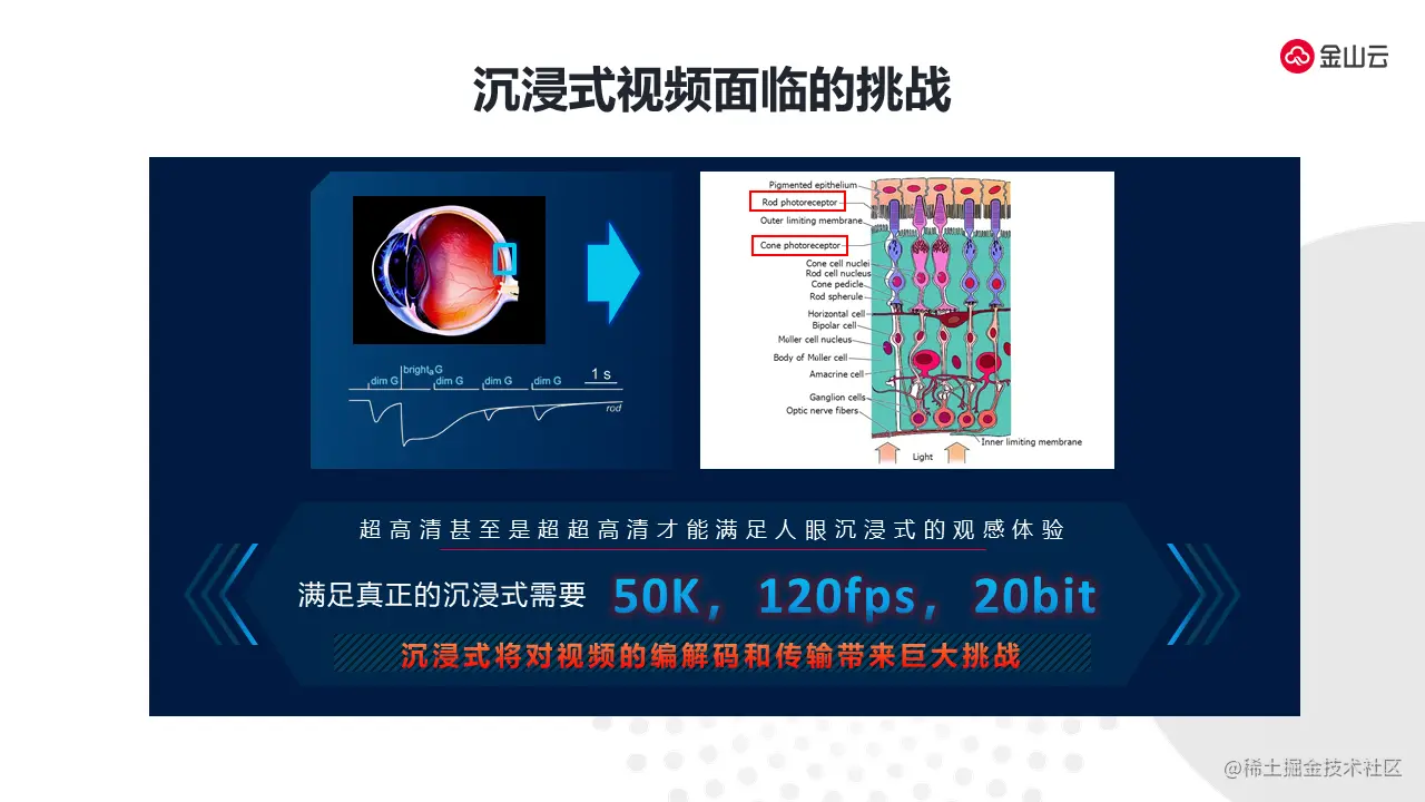 人眼对沉浸式视频的要求会更加的苛刻,人眼对视频机制的追求需要达到50K、120fps、20bit的分辨率和码率以及色域的要求,才能达到真正人眼沉浸式的需求。当前我们所看到的网上视频远远达不到这样的要求,更多的是720p、30fps、8bit。要达到人眼对沉浸式视频的要求,对视频的编解码以及传输会有非常巨大的挑战。