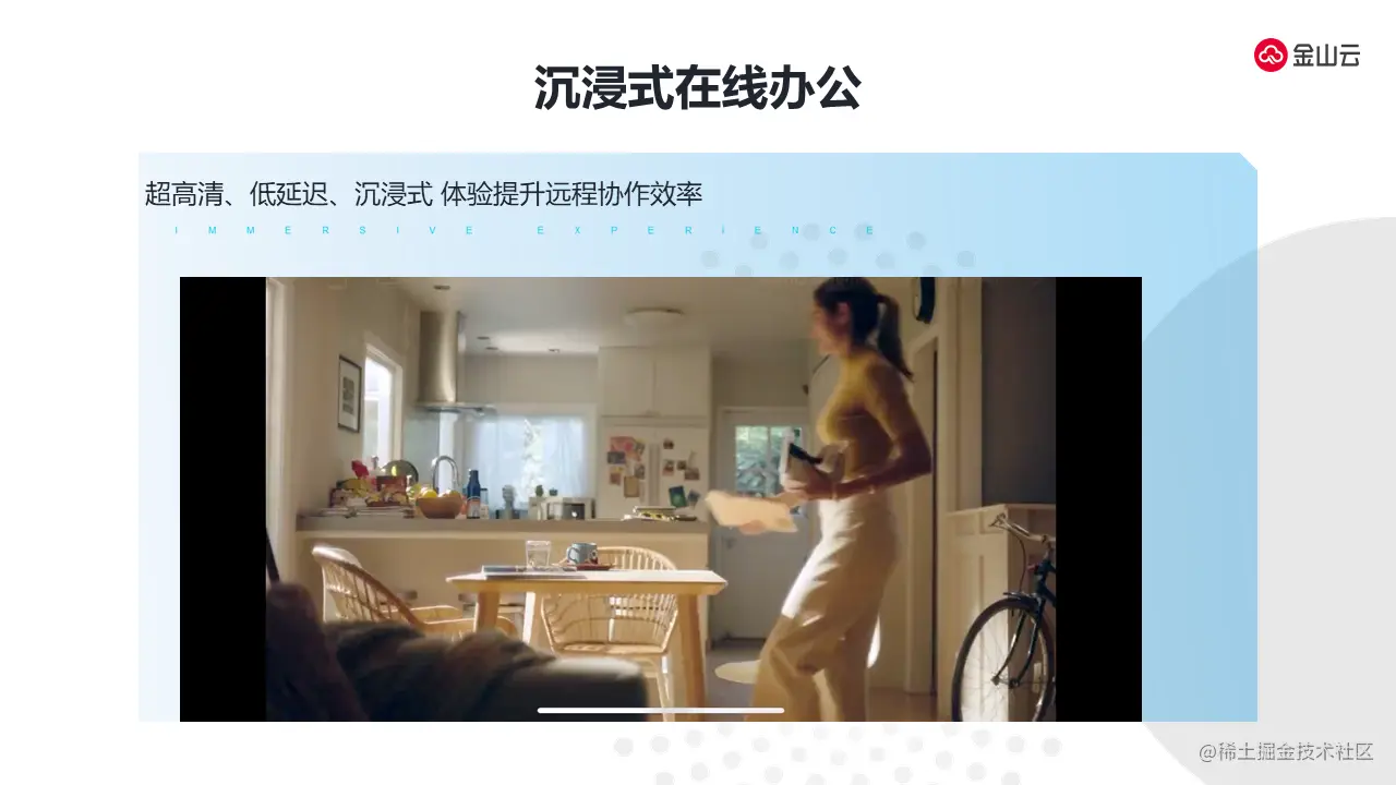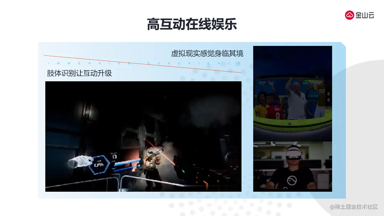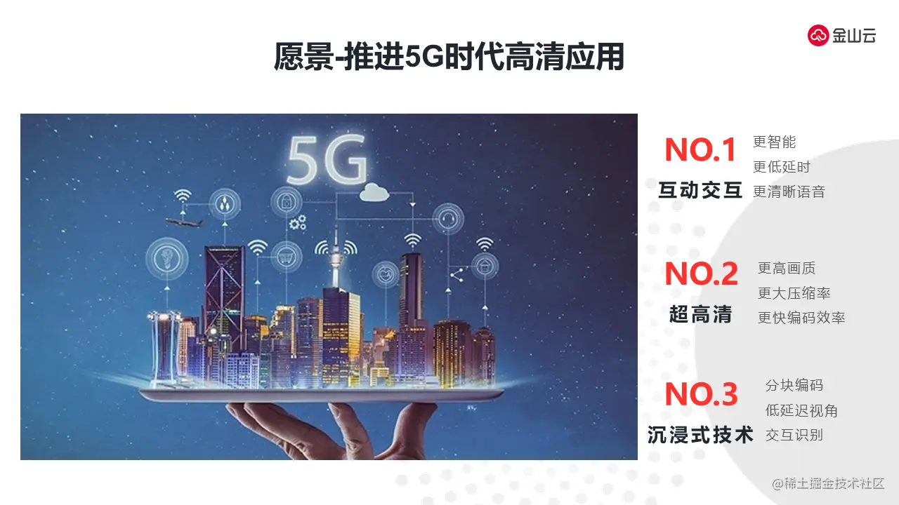 金山云是在上图三个大的方向上进行投入。第一方面是互动互联,通过我们的互动视频,可以使金山云更加智能、提供更低的延迟、更高清的语音和视频的效果。第二方面是超高清能力,提供更高的画质体验、更大的压缩率和更好的编码效率、提供更好的性价比编码服务和视频媒体处理服务。第三方面试沉浸式技术,通过分块编码、低延迟视角、FOV的低延迟的能力以及通过AI去加持交互识别可以提供整个沉浸式技术给到开放平台上进行开放,我们愿景是通过整个沉浸式视频的平台助推5G时代高清应用的发展。