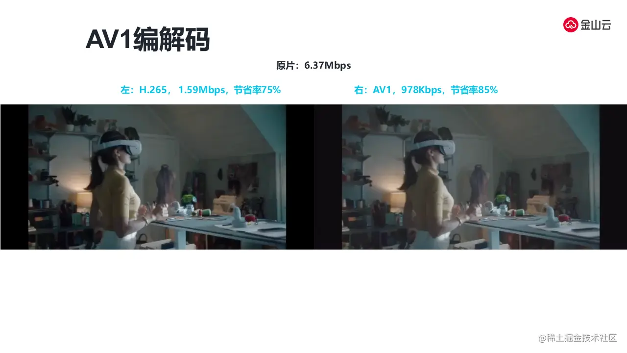 上图是AV1编解码的视频展示,原片是6.37M,在265编码下可以压缩到1.59M,节省码率带宽大概是75%。在AV1下可以进一步压缩到800多kb,码率节省达到85%,视频的传输上有非常大的支持,可以将码率降低到80%以上,她的传输质量还有她的传输延迟,都会有很好的体验上升。