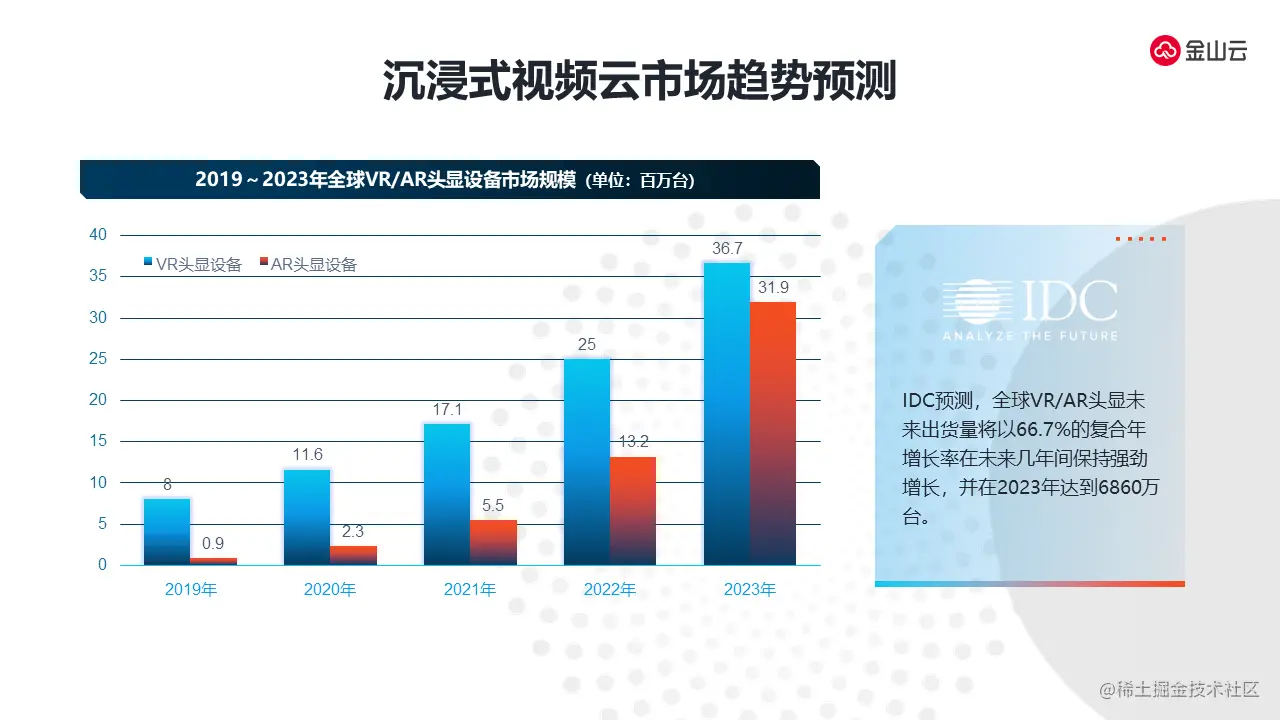 根据IDC的市场评估,沉浸式视频云市场发展的趋势处于飞速发展的阶段。从2019年到2023年五年期间,整个年复合增长率超过66%,由此看出这是个非常强劲的增长。到2023年,整个VR、AR设备的保有率将会超过6000万以上,这就是未来VR、AR的设备将有爆炸式增长。在硬件加持的基础上,开发者可以有更大的想象空间,未来VR、AR的应用和它创意性的应用会有很大增长。