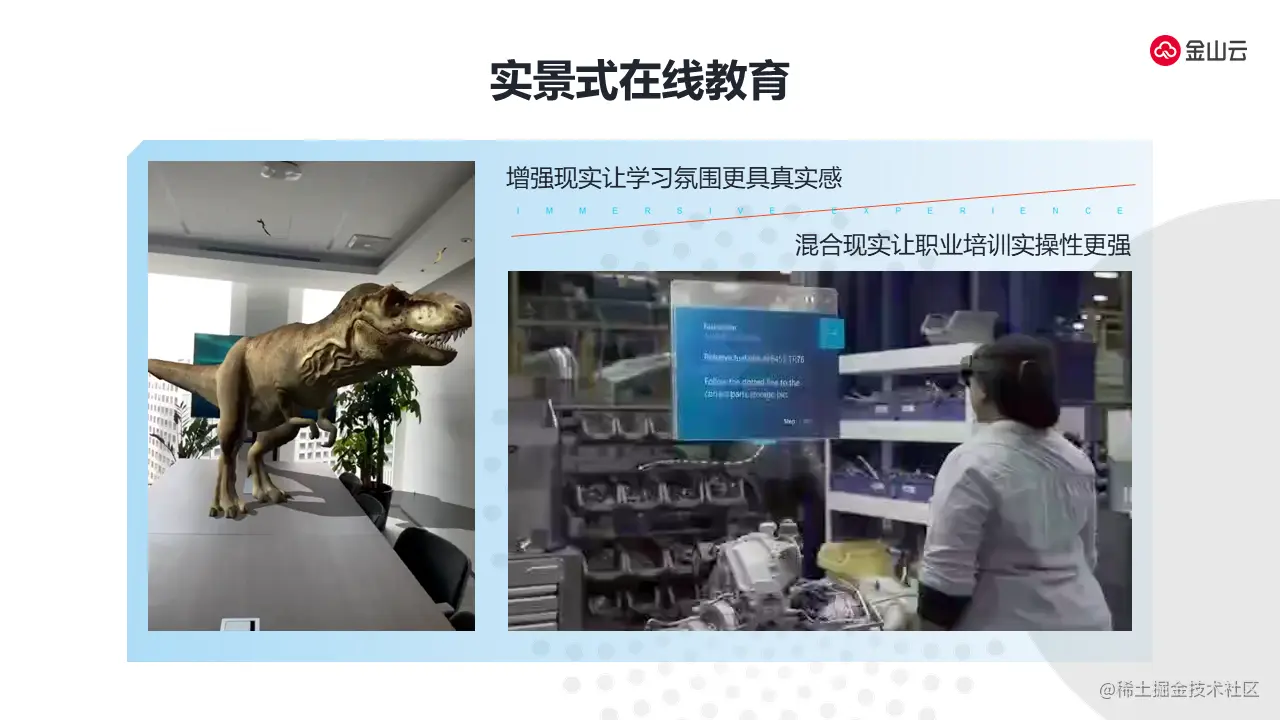 上图是实时场景下的在线教育,可以看出增强现实可以让学习更加具备真实感和代入感,上图中恐龙的场景,对于学生来说,它的代入感非常强,体验非常真实。而混合现实的操作可以让技术工人的操作更加有真实感。