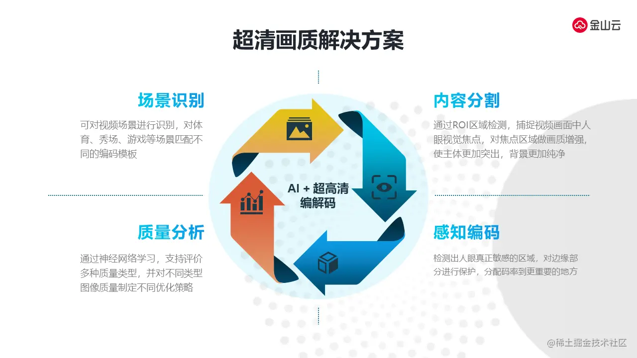 上图是在AI能力的加持下,AI加超高清编解码的解决方案。通过AI我们可以实现以上四个大的提升。第一个是场景识别,可以对视频场景进行识别,对体育、秀场、游戏等不同的场景进行匹配,对不同的场景运用不同的编码模板达到最优的编码应用。第二个是内容分割,通过ROI的分割,利用AI技术可以识别视频中的人眼关注的区域如嘴唇,更多会对这些重点区域进行视频增强,使主观的效果更加优秀,让主体更加突出,让背景看起来更纯净。第三个是质量分析,通过神经学习,金山云支持多重的评价质量类型包括KPA(图像视频感知评价体系)的质量分析和VMAF分析,这些分析可以对不同的视频进行质量的判定,比如对于高清的视频可以应用更激进的编码参数,对于低清的视频,可能会进行一个更好的修复,让整体效果更加优秀,视频质量进一步提升。第四个是感知编码,我们可以检测出人眼最关注的区域比如人眼对边缘的区域非常关注,会在边缘地方分配更多的码率进行编码。这四大块是通过AI加编解码的能力达到融合,使编码更加高效,分配码率更加合理,提高整个画质,降低传输码率。