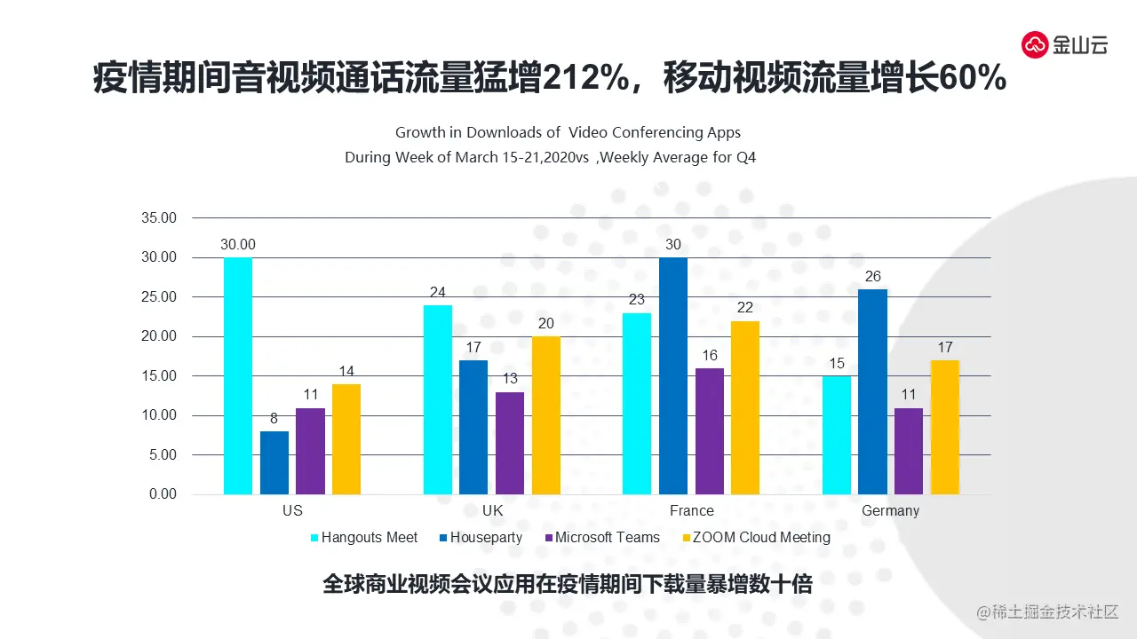 通过疫情催生,可以看出在整个视频流量上,音视频通话的流量猛增200%以上。与此同时,移动视频的流量增长超过60%。上图是在今年疫情期间音视频会议应用的下载,下载量暴增超过十几倍以上。黄色部分是ZOOM下载的增长,可以看出它的增长超过了29倍左右。浅蓝色部分是谷歌Hangouts Meet,超过了百分之二十几的增长。由此看出,在疫情期间音视频流量增长实际上远远超过预期。
