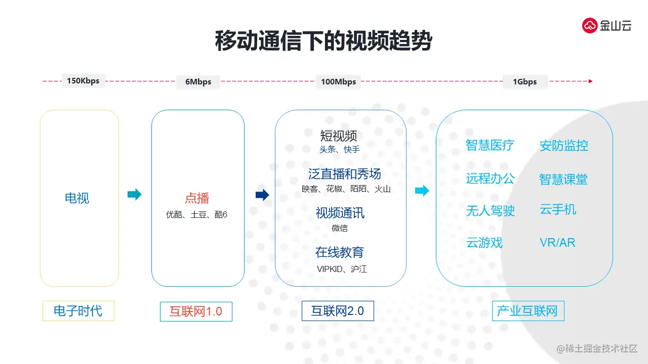 在电子时代,当时网络状况只有100KB左右网络带宽。当时我们更多的是在电视上观看视频。到了互联网1.0的时代,我们开始在PC上观看视频包括点播,当时比较流行的应用场景有优酷、土豆、酷6。在当时互联网1.0时代就是3G时代的标志性视频应用和网站。到了移动互联网时代,在4G网络的催生下爆发出一些类似于抖音快手的短视频应用以及现在非常流行的直播包括泛娱乐的场景、秀场,其中具有代表性的APP如映客、花椒、陌陌、火山,除此以外包括视频的通信如微信、ZOOM,音视频的通信也爆发起来。另外我们在疫情期间在线教育蓬勃发展属于在互联网2.0时代催生产物。互联网2.0时代的带宽大概是在百兆的网络状况。预测在下一个阶段产业互联网的阶段,随着5G带来的催生作用,5G带宽有极大的增长,网络从百兆提升到1GB。在此情况下,我们可以预估未来在医疗场景、监控、远程教育、在线课堂以及VR、AR云游戏场景下,会有爆发性的增长。