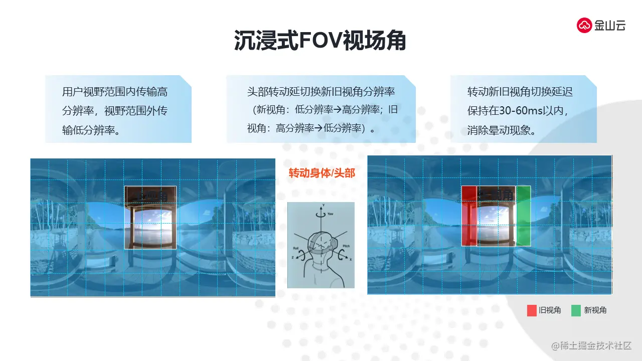 Tile编码是为了更好的实现FOV视场角的诉求。FOV视场角是在人眼上看到有一个范围,大概人眼能够观测的范围是90度的范围。沉浸式视频是360度的视角,但人眼最关注的区域在90度到120度之间。在人眼FOV视场角范围内,我们可以传输和展现高清的视频,当我们转头时,我们会把视场角由低分辨率切换到高分辨率,而视场角范围外就会从高分辨率切换到低分辨率,这个切换实际上是要求在视频的切换上需要保持在30毫秒到60毫秒以内。要达到这个,一方面需要Tile编码的支持,另一方面也需要边缘计算、网络传输、编码上的支持,让视频传输码率更小,它的传输延迟就会极大降低,才能够控制在60毫秒以内。除了传输之外还需要在头显上集成和适配。所以全链路需要“云、边、端”三端进行融合,才能实现低延迟的转头延迟。金山云在FOV上有一定的时间沉淀,在这方面会通过平台的方式以及解决方案的方式提供给客户、开放给开发者去进一步使用。以上就是关于技术上的一些分享。