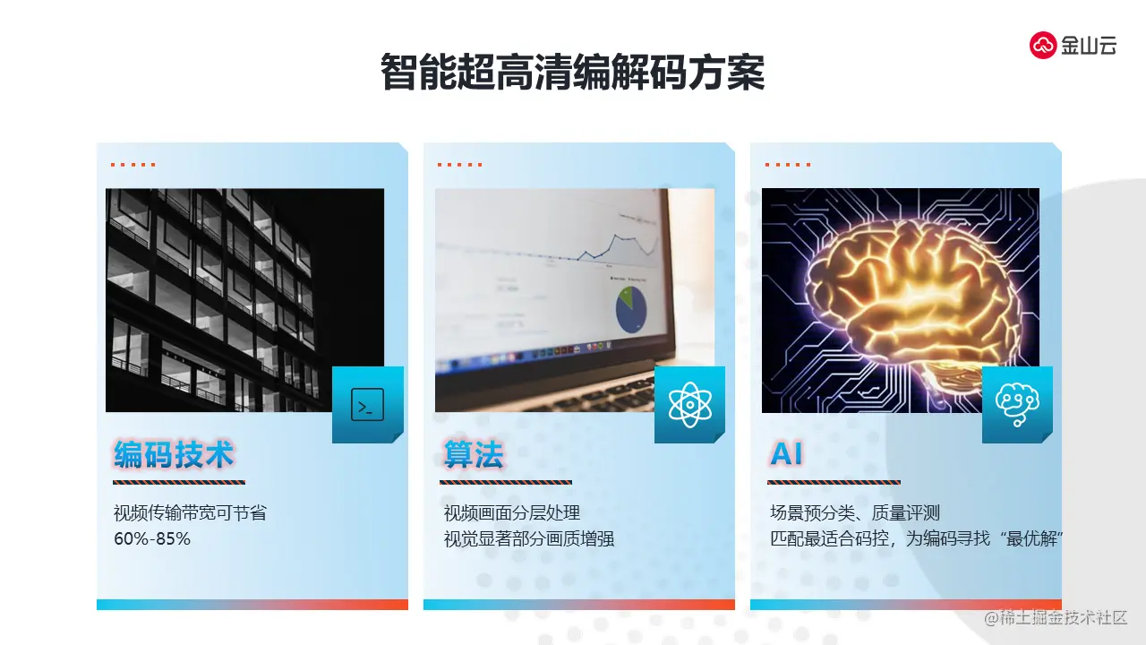第一部分金山云在编解码技术上超过了5年的技术的积累,编解码技术可以为客户节省带宽超过60%甚至80 %以上的压缩率。这个压缩率数据在行业中处于非常领先的能力水平。第二部分是通过我们的算法包括图像算法、编码算法,将画面进行分层的处理、重点去进行画质的增强。第三部分是AI技术,通过场景预测分析,画质的分析,我们可以为视频客户相应不同场景的视频,提供编码的最优解,达到场景化最优编码方案提供给使用者。