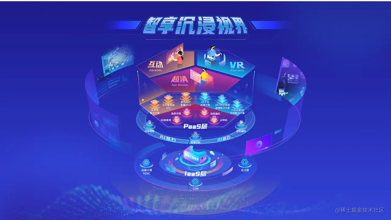 金山云的产品布局主要集中在三个方面:互动性,去提高视频的互动能力;超高清;VR技术。这三块技术构建在整个金山云的IaaS平台的基础上。IaaS拥有大规模的云计算平台、CDN的流量分发,以及RTC加边缘计算等底层IaaS技术。通过IaaS技术,构建对开发者提供完善的PaaS的平台,包括边缘计算平台,以及边缘计算加RTC音视频传输的能力,这是我们在互动低延迟上能力输出。第二部分是超高清,超高效除了开放编解码技术、8K、10bit编码能力,还提供了包括画质评测以及魔镜平台,这些专门针对超高清的产品去提供给开发者和客户去使用,在VR上我们会专注于低延迟的VR编解码、VR传输、在AI加持下的手势肢体识别去提供整个VR的解决方案。以上是金山云在产品上的布局。