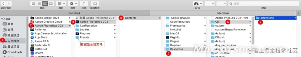 - 打开访达,点击顶部菜单前往打开里面“应用程序”打开Adobe PhotoShop文件夹,在PS图标上进行右击,选择显示包内容,然后依次进入 Contents/Resources/CEP/extensions,将插件文件夹复制进去。