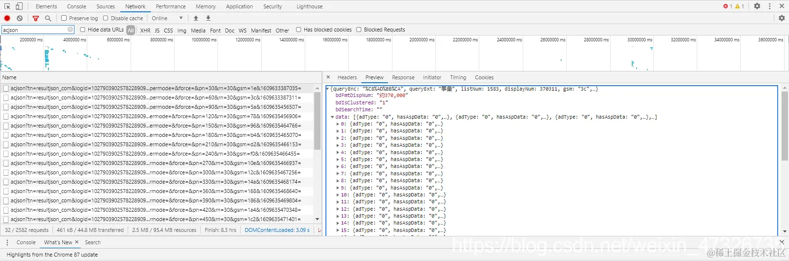 打开浏览器自带的抓包工具,重新加载一下网站,耐心的寻找响应,最后终于找到了。图片的地址居然藏在Json中,那事情似乎变得简单了起来。