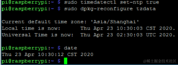 树莓派系统时间配置 用户1676151250752 2021-02-19 142 阅读1分钟 1. 打开时间同步服务 sudo timedatectl set-ntp true 2. 选择上海时区 sudo dpkg-reconfigure tzdata 在弹出的第一个界面中选择Asia,并敲回车 3. 然后再弹出的窗口中选择Shanghai 4. 用date命令检查时间是否正确