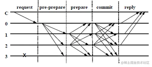 在PBFT算法中,所有节点都在相同的配置下运行,且有一个主节点,其他节点作为备份节点。主节点负责对客户端的请求进行排序,按顺序发送给备份节点。存在视图(View)的概念,在每个视图中,所有节点正常按照处理消息。但当备份节点检查到主节点出现异常,就会触发视图变换(View Change)机制更换下一编号的节点为主节点,进入新的视图。PBFT中客户端发出请求到收到答复的主要流程如图4.1所示[10] [11],服务器之间交换信息3次,整个过程包含以下五个阶段: