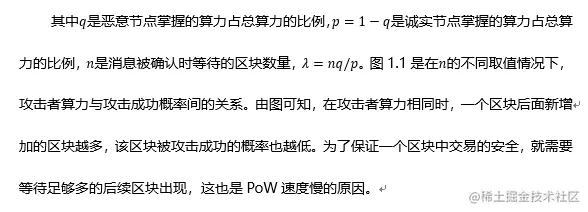 PoW共识算法以算力作为竞争记账权的基础,以工作量作为安全性的保障,所有矿工都遵循最长链原则。新产生的区块包含前一个区块的哈希值,现存的所有区块的形成了一条链,链的长度与工作量成正比,所有的节点均信任最长的区块链。如果当某一组织掌握了足够的算力,就可以针对比特币网络发起攻击。当攻击者拥有足够的算力时,能够最先计算出最新的区块,从而掌握最长链。此时比特币主链上的区块大部分由其生成,他可以故意拒绝某些交易的确认和进行双花攻击,这会对比特币网络的可信性造成影响,但这一行为同样会给攻击者带来损失。通过求解一维随机游走问题,可以获得恶意节点攻击成功的概率和算力之间的关系: