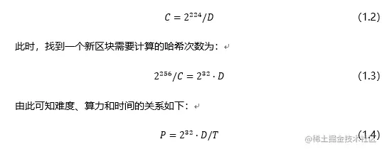 其中最大目标值和当前目标值都是256位长度,最大目标值是难度为1时的目标值,即2224。假设当前难度为,算力为,当前目标值为,发现新区块的平均计算时间为,则