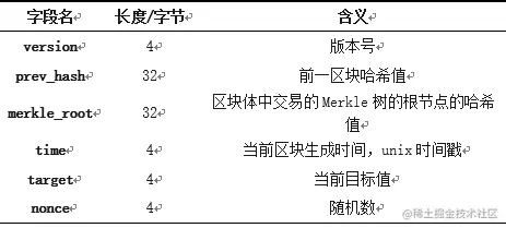 在区块头部填写如表1.1所示的区块版本号、前一区块的哈希值、时间戳、当前目标哈希值和随机数等信息;