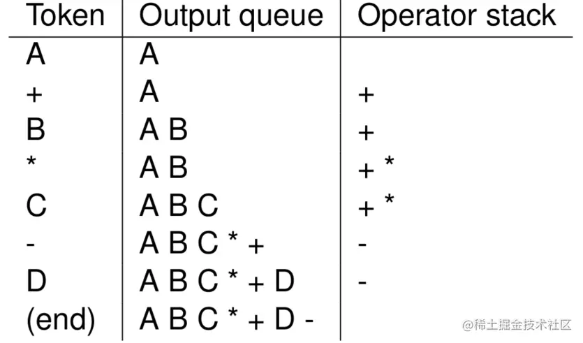 - 如果是操作数, 就直接加入队列; 如果是操作符, 需要和栈顶的元素进行比较, 如果栈顶元素的优先级大于或者等于操作符, 则将栈顶元素加入队列, 然后弹出。不断重复直到栈为空, 或者优先级小于当前操作符, 然后将当前操作符加入栈;