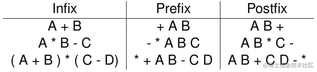 正如我们通常了解的一个表达式可以分成三种类型, 操作符在前, 操作符在中间和操作符在后面。如下图所示: