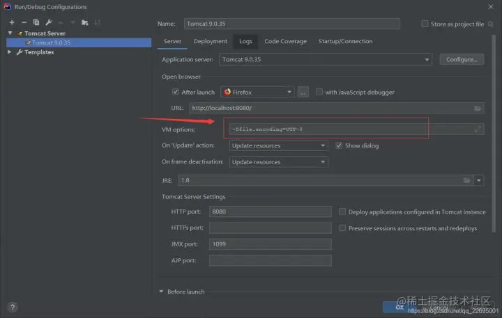 上方导航栏“Run→Edit Configurations…”进入配置页面,修改当前 Web 项目 Tomcat Server 的虚拟机输出选项 VM options 添加 -Dfile.encoding=UTF-8 。在重启之后运行程序检查控制台信息,如果不管用请执行下面的步骤。