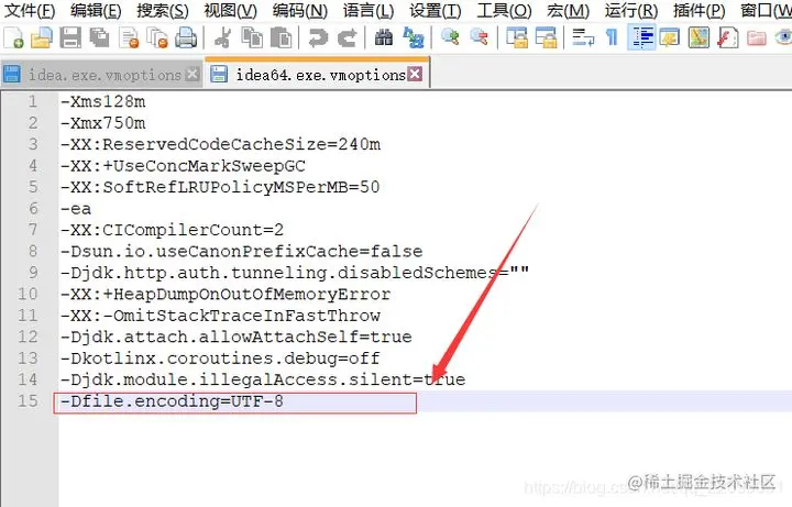 我们打开 IntelliJ IDEA 在本地的安装目录,找到下面两个文件,使用记事本打开,在最后一行添加-Dfile.encoding=UTF-8 即可。在重启之后运行程序检查控制台信息,问题解决!