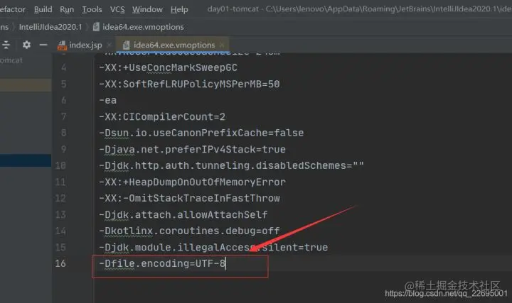在 idea64.exe.vmoptions 文件尾加上-Dfile.encoding=UTF-8。在重启之后运行程序检查控制台信息,一般到了这步问题就解决了,当然如果不管用请执行下面的超级步骤。