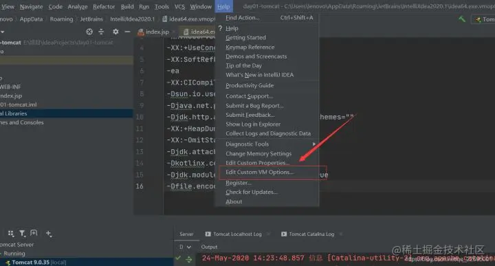 上方导航栏“Help→Etit Custom VM Options…”进入自定义虚拟机选项页面。