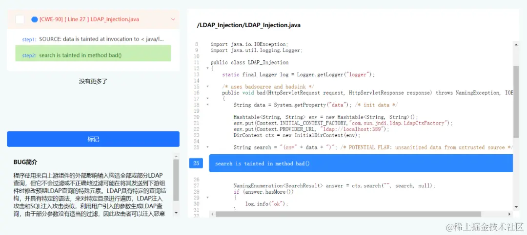 用Wukong检测上述程序代码,则可以发现代码中存在着“LDAP注入”缺陷,从跟踪路径中可以分析出数据的污染源以及数据流向,如下图: