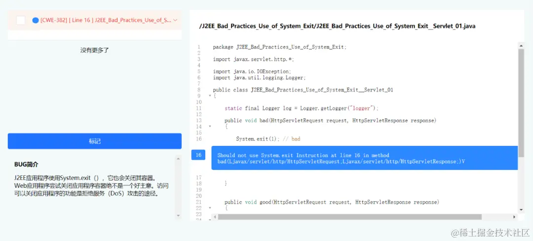 用Wukong检测上述程序代码,则可以发现代码中存在着“调用System.exit()” 导致的代码缺陷,如下图: