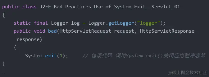 System.exit()其实是Java中结束进程的方法,调用它将关闭当前的JVM虚拟机。对于web应用程序来说,尝试关闭应用程序容器绝不是一个值得推荐的方法,因为调用可以关闭应用程序的函数可以作为拒绝服务(DoS)攻击的一种途径。