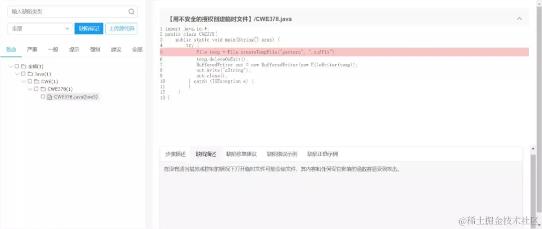 用Wukong检测上述程序代码,则可以发现代码中存在着“用不安全的授权创建临时文件” 导致的代码缺陷,如下图: