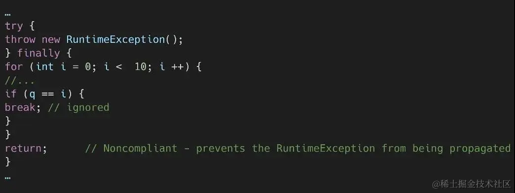 1、代码在finally块中有一个return语句。try块中的异常因finally块中的return无法到达exit块被抛出。