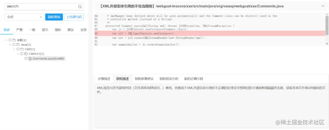 用Wukong软件检测上述程序代码,则可以发现代码中存在着“对XML外部实体引用的不当限制” 导致的代码缺陷,如下图: