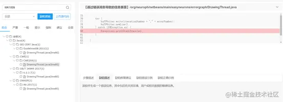 用Wukong软件检测上述程序代码,则可以发现代码中存在着“通过错误消息导致的信息暴露” 导致的代码缺陷,如下图: