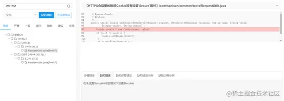 用Wukong软件检测上述程序代码,则可以发现代码中存在着“HTTPS会话里的敏感Cookie没有设置”Secure属性” 导致的代码缺陷,如下图: